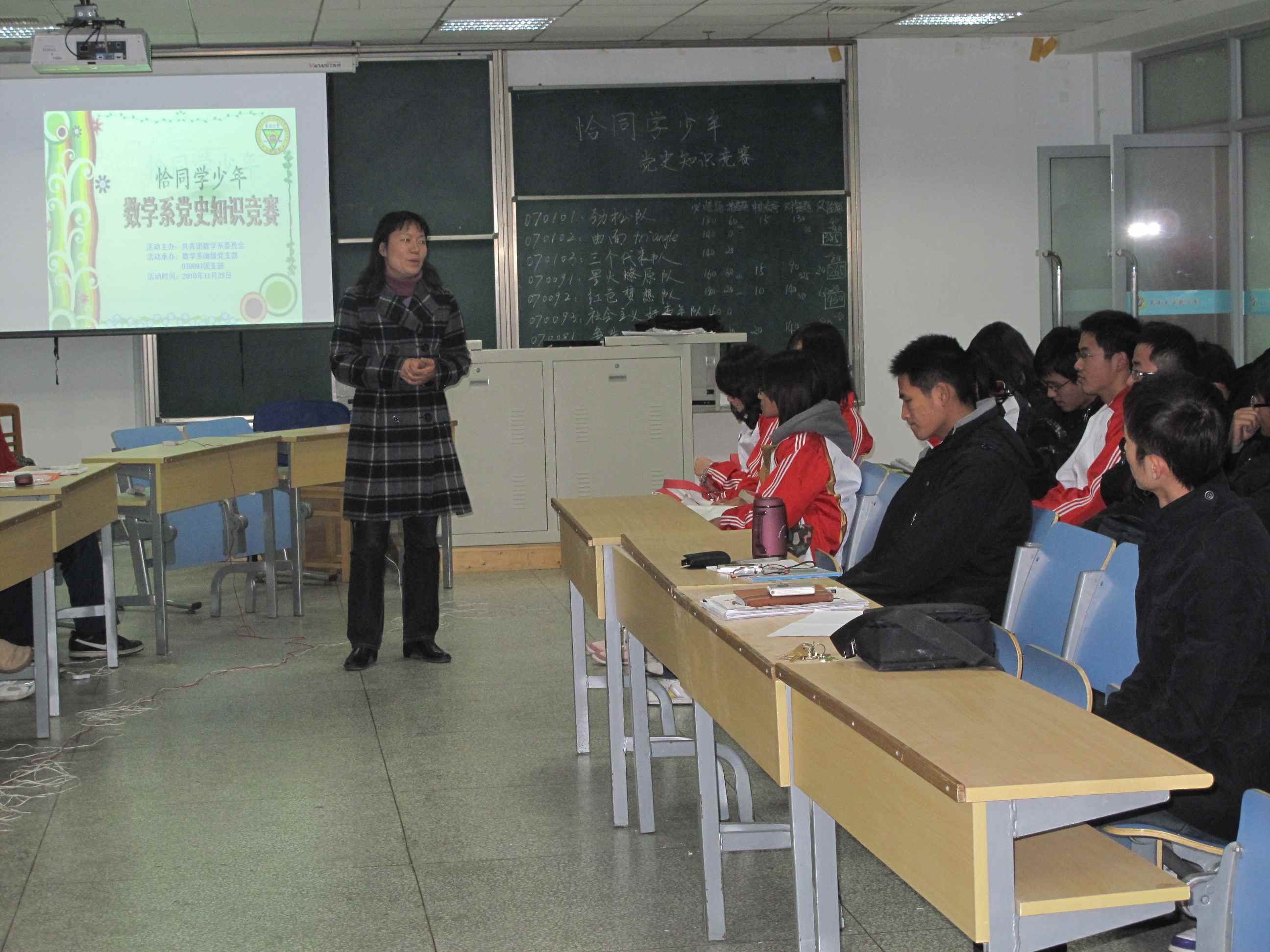 11月25日晚,数学系首届“恰同学少年”党史知识竞赛在图书馆数学系第二报告厅揭开了帷幕,尽管初冬的天气阴冷,但却无法抵挡同学们如火的热情,大厅里暖意融融。数学系党委书记宋晓燕,团委书记袁煜昶以及张涌教师也应邀出席。