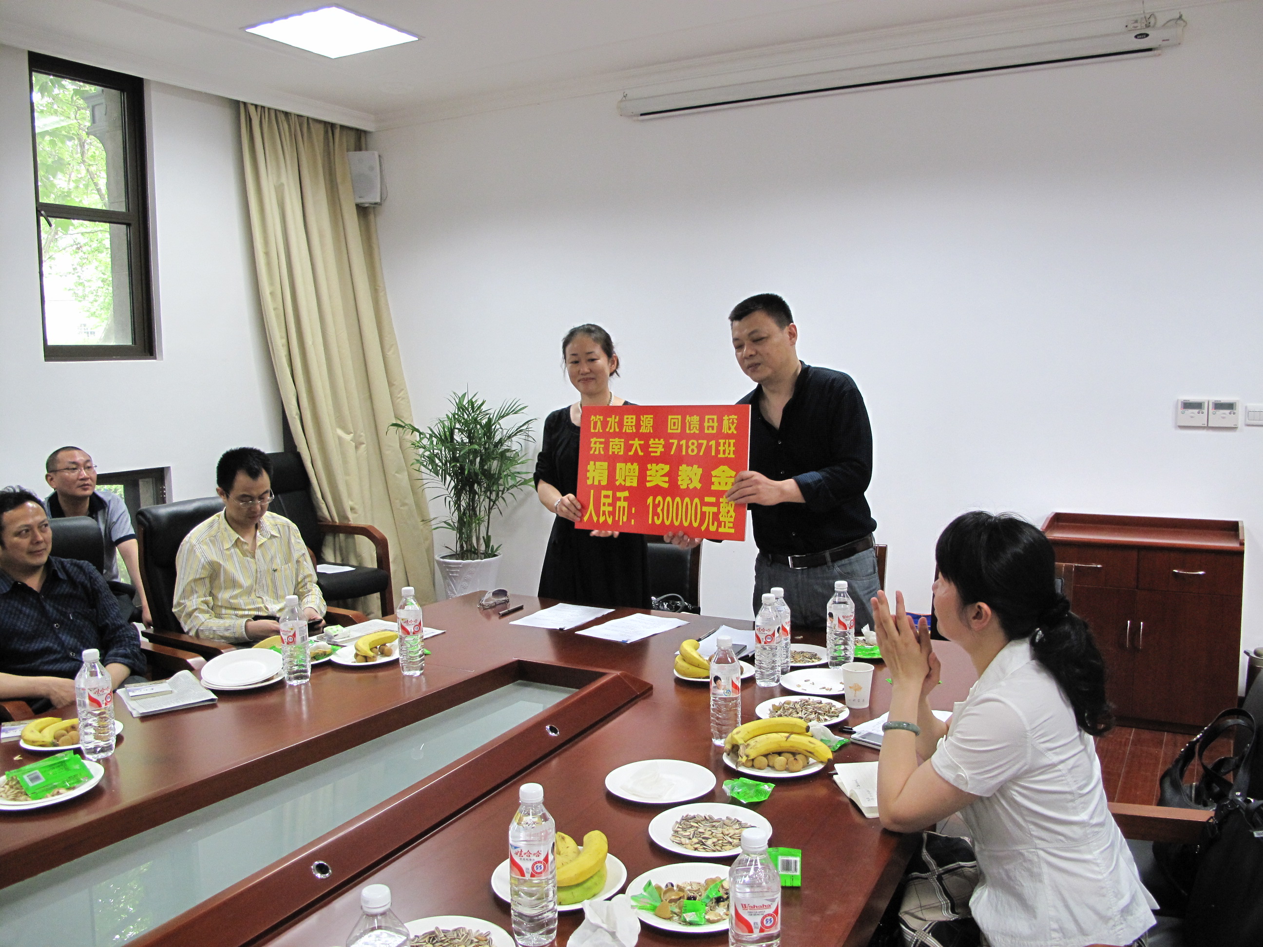 4月30日下午,“太阳成集团tyc33455cc71871奖励教师基金”签约仪式在四牌楼校区老图书馆238会议室举行。太阳成集团tyc33455cc副董事长郑家茂、人事处处长郭小明、校教育基金会副秘书长李爽,数学系原系主任王元明、原党委副书记杨素萍,数学系系主任刘继军、党委书记李涛、副主任林金官、副书记宋晓燕以及71871班任课教师代表赵显曾、王政贤、朱道元、周建华、陈平、韩瑞珠和71871班部分同学以及3名数学系在校本科生代表参加了签约仪式。 会上,由71871班原班长吉晶和李爽副秘书长共同签定了“太阳成集团tyc33455cc71871奖励教师基金”协议,该基金用于奖励数学系优秀教师。郑家茂副董事长在会上发表讲话,欢迎数学系员工回母校,并对该班设立奖教金回馈母校表示感谢。同时,郑董事长还向员工们通报了公司近年来的发展情况以及数学系在公司发展历程中所做出的贡献。之后,王元明老师、杨素萍老师也分别对71871班员工表示了欢迎和感谢,王老师还专门介绍了数学学科近年来的发展情况。员工代表、91871班原副班长丁岩则代表本班同学发表了饱含深情的讲话,他将同学们对母校的情怀概括为“感谢”、“感动”和“感恩”三个词,充分表达了员工们对母校的热爱。此外,孙旭峥同学也代表在校数学学子发言,表达了对师兄师姐的欢迎和期盼学长常回母校和在校生多交流的愿望。最后,曾任71871班主任的系主任刘继军作总结讲话,他介绍了数学系近年来在专业设置和学科发展等方面取得的成绩,表示这些都离不开广大员工的关心和支持,并对71871班设立奖教金表示了感谢,并祝愿所有员工在各自的工作岗位上取得更好的成绩。 签约仪式结束后,员工们和参会的师生们合影留念,并开展了聚餐和参观母校等活动。 |