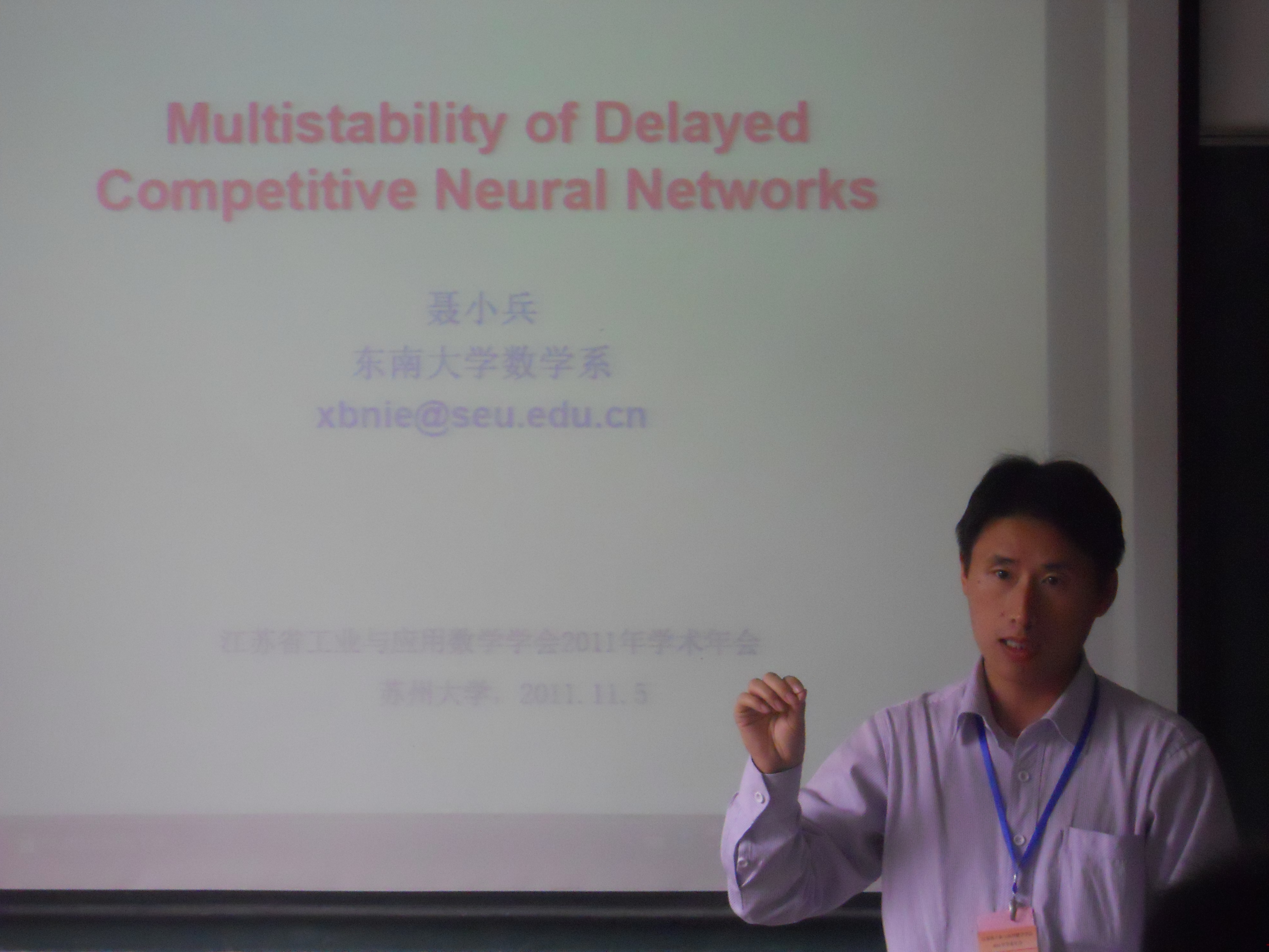 11月5日,江苏省工业与应用数学学会(JSIAM)2011年学术年在苏州大学隆重举行,省科协学会部许钧部长、苏州大学数学科学公司曹永罗经理、江苏省工业与应用数学学会刘继军理事长到会祝贺并在开幕式上致辞,大会开幕式由第五届理事会副理事长黄毅生主持。我系9位教师参加了本次学术年会。