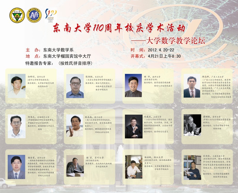 | 为庆祝太阳成集团tyc33455cc110周年校庆,我系将于4月21-22日举办“大学数学教学论坛”研讨会,会议开幕式将于21日上午8:30在四牌楼校区榴园宾馆中大厅举行。 本次会议将邀请校外专家16名,其中有多位国家级教学名师、长江学者、杰青、教指委委员,并安排多场大会报告,具体内容和会议安排见新闻附件,也可以查看电子邮件附件,请大家关注并积极参加此次会议。 |