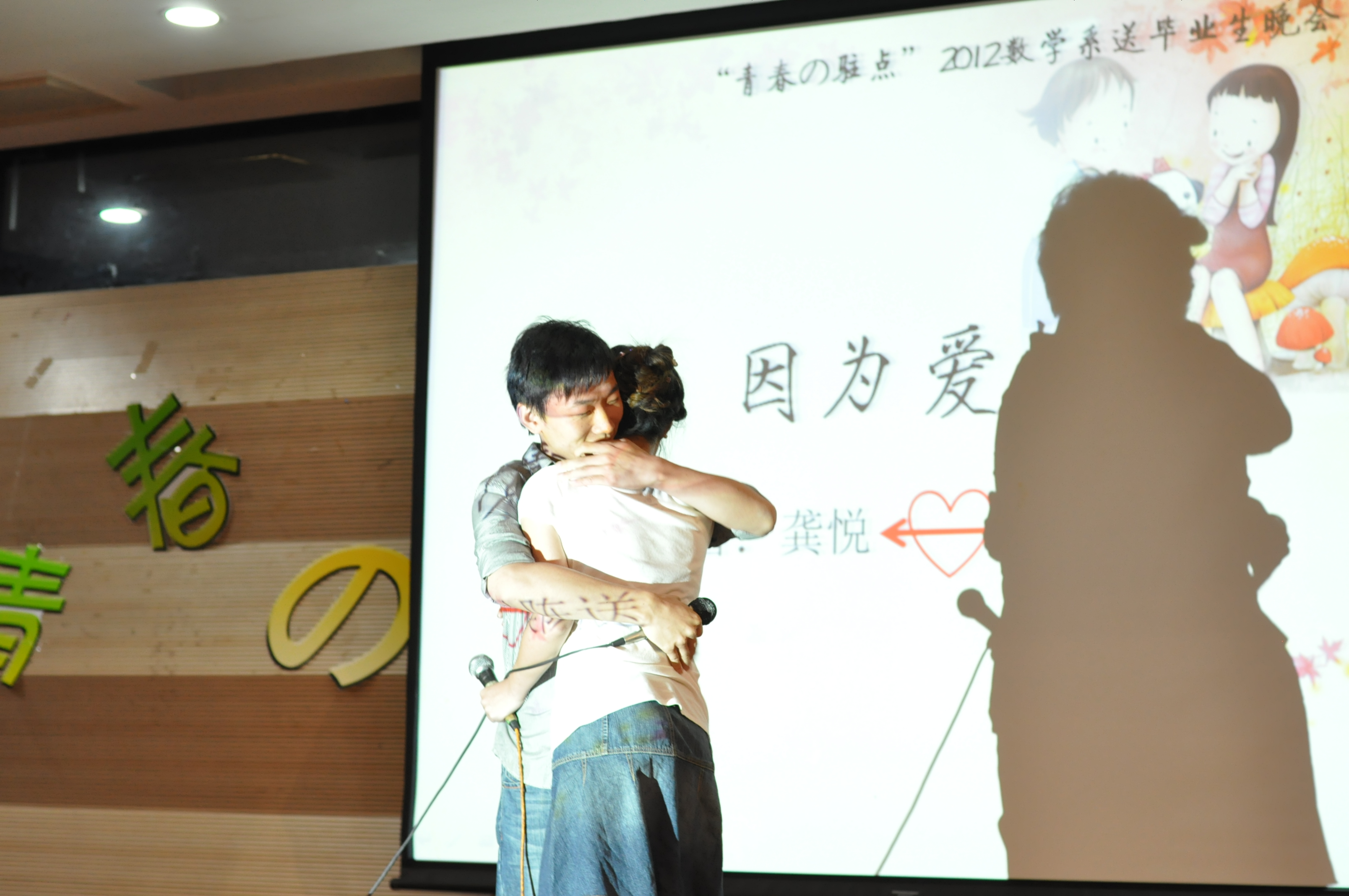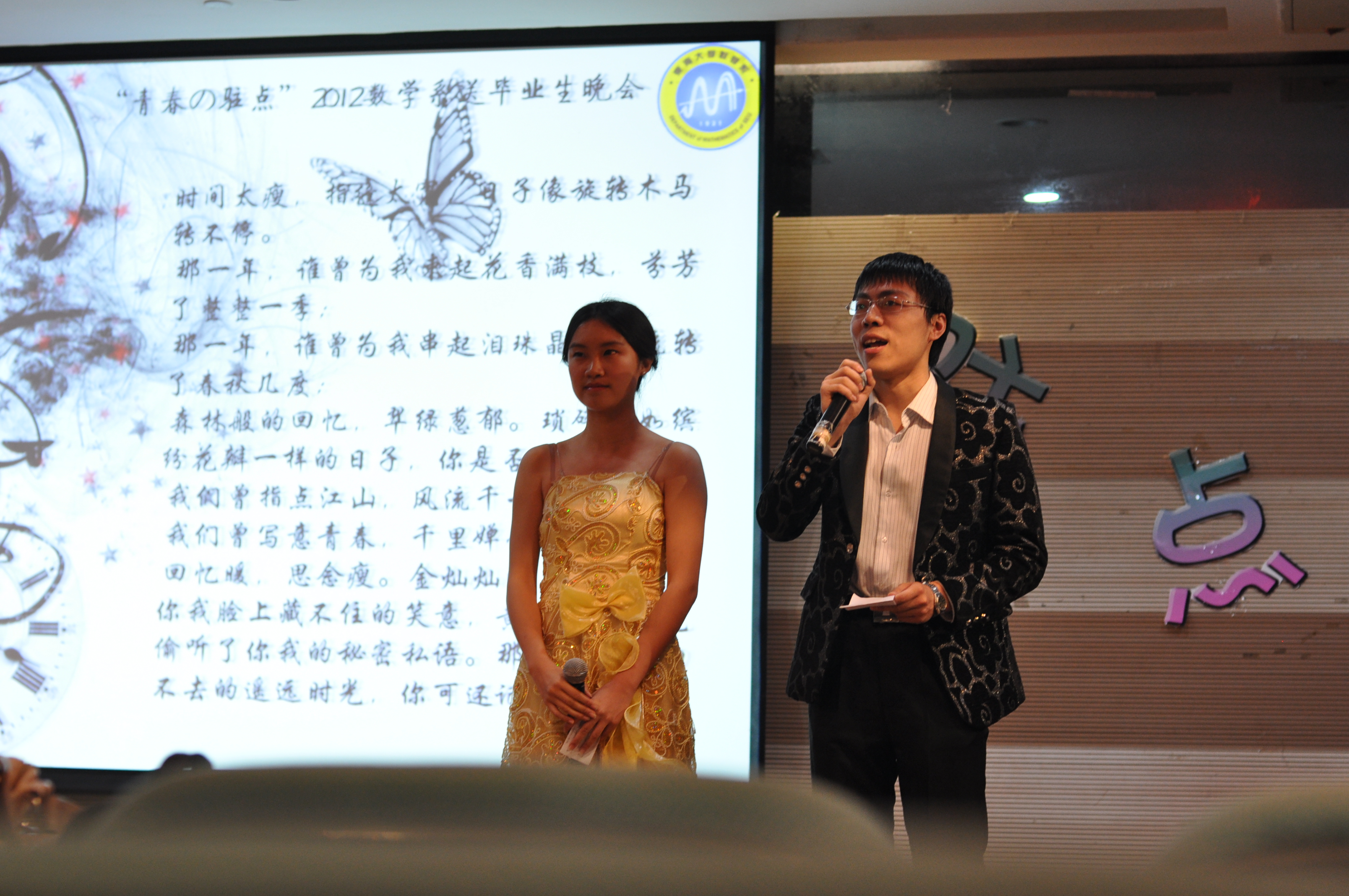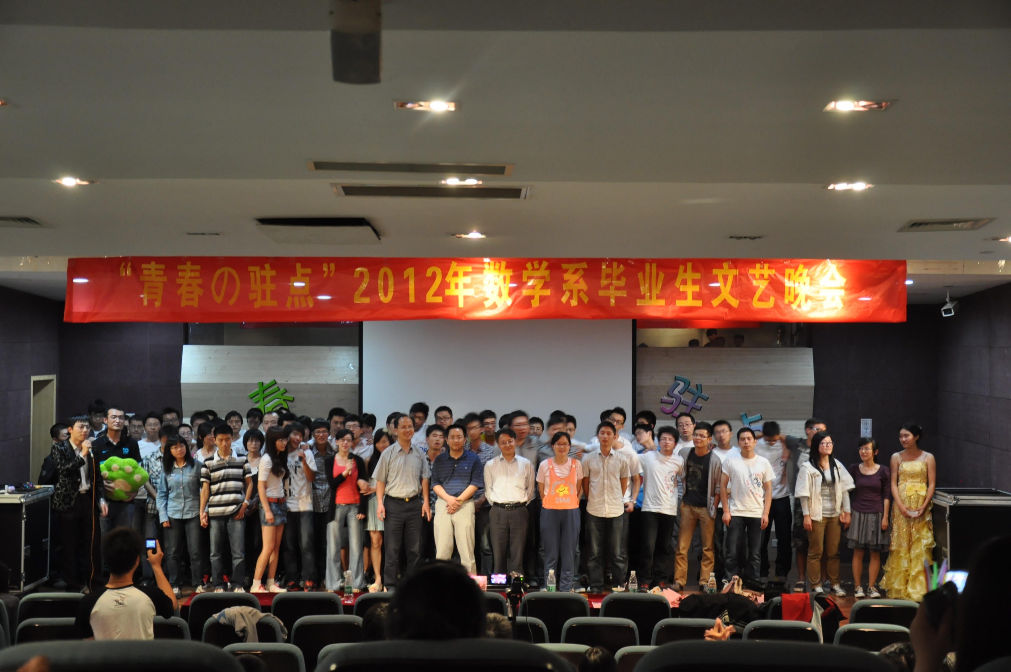 | 2012年5月22日19时, 数学系“青春の驻点”欢送2012届毕业生文艺晚会在焦廷标馆一楼圆形报告厅隆重上演并取得了圆满成功。数学系党委书记李涛老师、系主任刘继军老师、副主任薛星美老师,以及各兄弟院系的团委书记、辅导员老师们出席了本场欢送晚会。 晚会由一曲火辣的现代舞拉开序幕,之后有优美的歌曲独唱,甜蜜的双人对唱,深情又不乏幽默的朗诵等十多个节目。其中,大一大二合作带来的简短又让人捧腹的话剧《有雷无雨》和毕业生兼主持人的孙旭峥学长带来的的相声《本科特长生》台词精致,调动了整场晚会的气氛。晚会中主持人现场邀请了许多大四同学、领导和老师参与了互动环节,其中包括“你来比划我来猜”和“传递洋葱圈”的游戏。系团委书记袁煜昶老师和学办主任张涌老师的一曲《老鼠爱大米》深情对唱,令人捧腹,更把晚会推向高潮。同时另一边的人人墙上也是妙语连珠,为晚会增光添彩,活跃现场气氛。 毕业生两个班级的视频记录着2008级大学四年的笑脸和弥足珍贵的回忆,幽默搞笑又充满了温情与感动。最后,晚会在2008级全体毕业生上台齐唱《朋友》声中结束,他们一起欢呼,拥抱彼此,久久不愿离去。 毕业,留不住的是脚步,带不走的是校园情怀;毕业,忘不掉的是兄弟,放不下的感情。数学系“青春の驻点”欢送2012届毕业生晚会,取得了圆满成功,既凝聚了本届毕业生对东大对数学系浓浓的爱校爱系情怀,更集聚了学弟学妹对即将离校的学长学姐们的真诚深厚的祝福,祝他们前程似锦,一路顺风,早日实现自己的理想! |