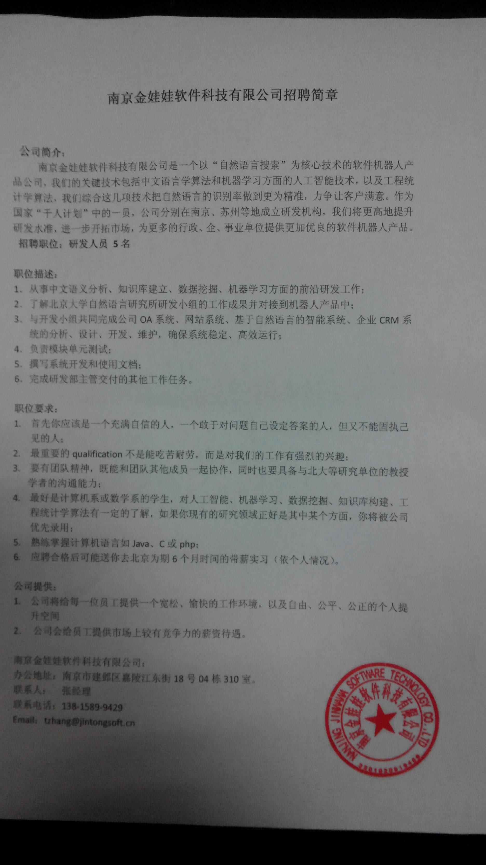 因公司提供的是纸质版招聘简章,故拍成照片提供给大家,这是一个潜力比较大的初创型公司。请有意向的同学自行通过电话或者邮件联系