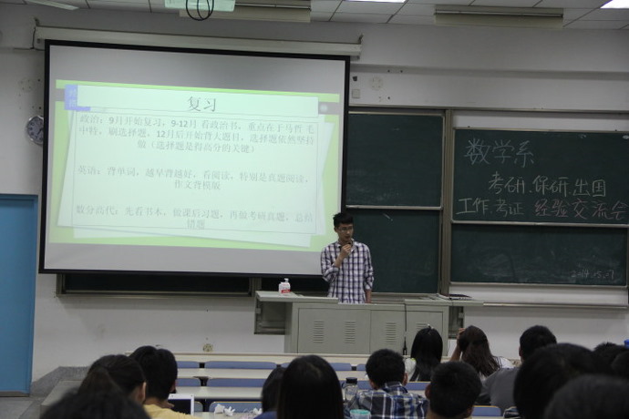 2014年5月8日晚7点,由数学系团委主办、数学系科协与数学系员工会秘书处共同承办的数学系“体验感悟 成长”经验交流会在教6-304准时举行。交流会邀请了大四优秀毕业生代表和在本校读研的研究生代表,与我系低年级员工分享、交流他们关于考研、保研、出国、工作、考证方面的经验,共同探讨如何在宝贵的大学四年中蜕变成长、对自己准确定位并规划未来。 本次交流会由两个环节组成。第一个环节中,学长学姐们根据自身经历与同学们交流他们关于保研、考研、出国、工作、考证等方面的感悟和经验。孙丁茜、恽钧超分享了自己保研的经历及相关事项,刘超介绍了自己准备考研的过程并建议同学们尽早联系相关的导师,陶博、居晟两位同学探讨了出国读研的意义并介绍了申请出国的经历及准备过程,侯耀斌、李瑶分别讲述了他们求职的经历以及在大学四年中做好就业准备,楼宝梁同学则介绍了成功考取准精算师证的经验、为准备考证的同学们明灯指路。第二个环节中,同学们和学长学姐们就感兴趣的问题进行一对一的交流,氛围热烈而融洽。交流会高潮迭起,在历时两个小时后,最终圆满落幕。 本次活动,学长学姐们毫不吝啬地分享了他们在大学四年所积累的宝贵经验。为将来不论是考研、保研,还是出国、就业的同学们在规划未来时提供了宝贵建议。希望通过这次活动,同学们能够吸取相关的宝贵经验,合理规划自己的未来。最后衷心祝愿数学系的每一位同学都能不辜负宝贵的大学四年,收获美好的未来! |