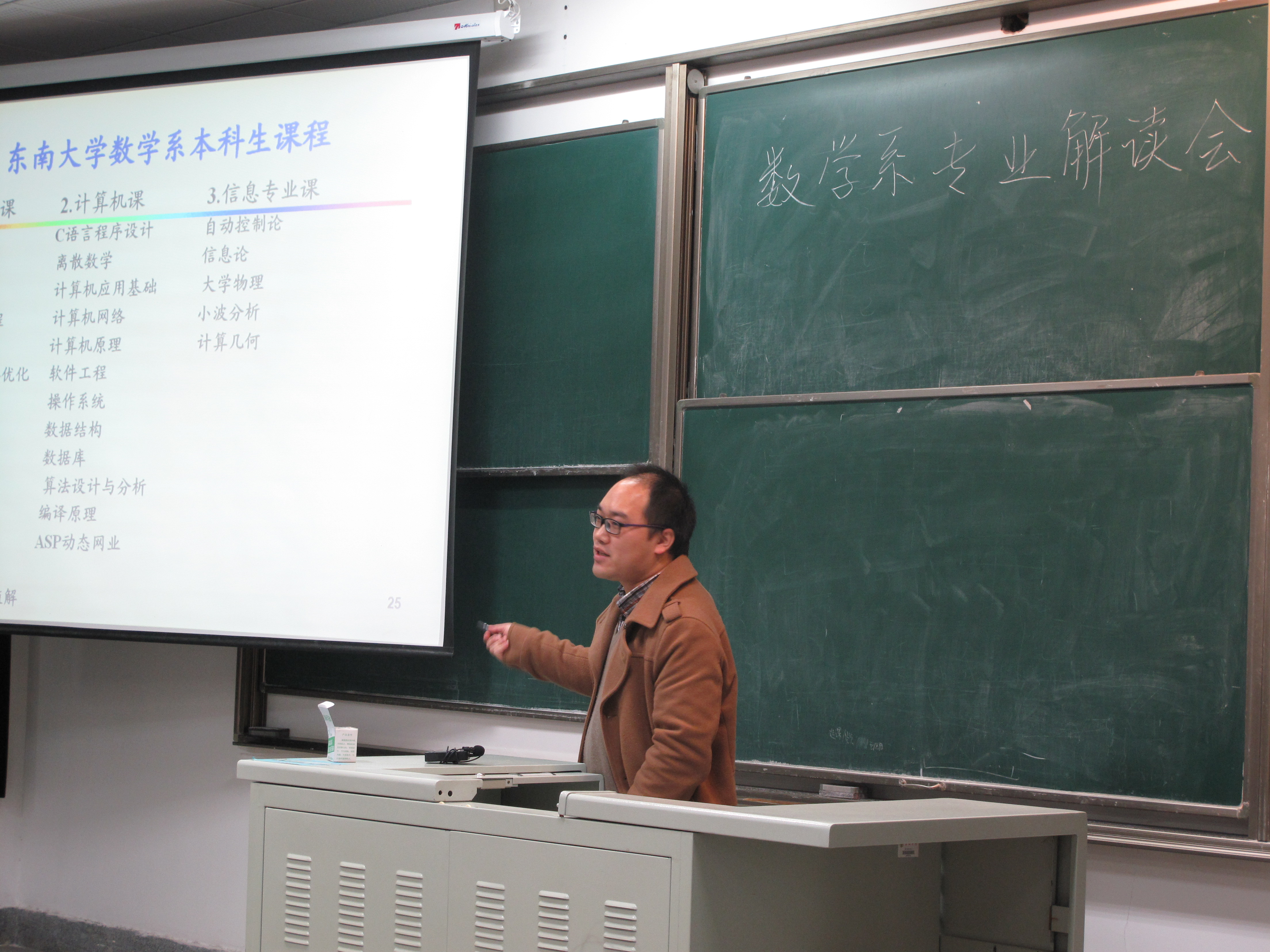 | 2014年12月26日中午在教二103,面向数学系大一新生的数学系专业解读会如期举行,数学系党委副书记曹海燕老师、副主任虞文武老师、统计学教研室副主任黄姓芳老师、信息与计算科学教研室殷翔老师和2014级各班班主任老师出席了本次大会。此次大会由数学系科协主办,邀请数学系三个专业教研室的相关老师面向2014级的新生进行各自专业的深入解读,使刚步入大学的数学系本科生对数学系及其三个专业有了详细的了解。 首先,虞文武老师就应数专业的相关情况做了详细的介绍。他以数学与网络科学为主题,从背景介绍,复杂网络协同控制,协同控制中的数学理论与方法,展望与思考四个方面进行了生动的汇报,阐述了应用数学是一门重要的学科。接下来,殷翔老师带领同学们了解了数学与计算科学。殷翔老师主要介绍了计算科学的特色及东大计算科学的优势,并对同学们的大学学习提出了殷切希望。最后,黄性芳老师为同学们介绍统计学的相关情况。除了对统计学,统计学的研究方向及课程安排进行介绍外,黄性芳老师强调了统计专业在在从事与统计、金融、管理等行业和继续深造方面的优势。 宣讲会过程中,老师们的讲解深入浅出,充分为员工考虑。同学们都认真聆听,细心思考。此次宣讲会对14级员工了解数学系各专业提供了极大的帮助,取得了圆满的成功。(田方正) |
