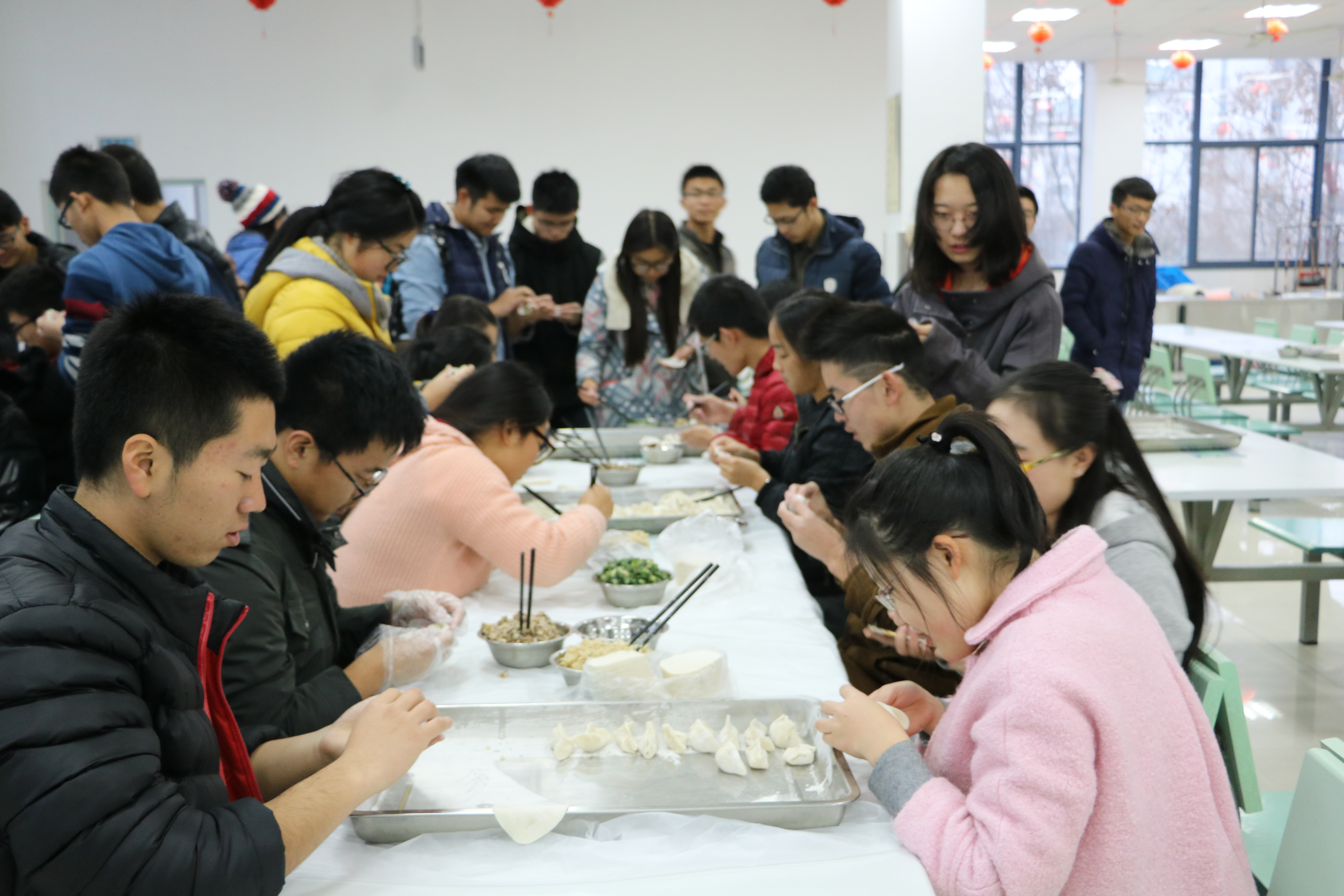 下午4时,由数学系领导、老师及本科生、研究生所有班级同学一起参加的“团圆饺子宴”在梅园食堂二楼热闹开幕。数学系近300位师生齐聚一堂,一起围桌而坐,吴书记宣布饺子宴开始后,大家分工明确,一切进行得秩序井然。看到饺子馅和饺子皮纷纷端上桌时,师生们都摩拳擦掌、跃跃欲试,准备大显身手。同学们包的饺子各式各样,形态各异,有花边形的,有馄钝样的,有包子款的,甚至还有创意地组合套餐形的,包饺子现场成了创意大赛,热闹非凡。在吴书记和曹主任的鉴赏中,我们还评选出了7个“7系最美饺子”。包好后的饺子都被送到后厨,待食堂师傅推着热气腾腾的饺子车过来时,员工们都迫不及待地一拥而上,尽情地享受着,师生们一起边吃边聊,其乐融融,到处洋溢着温暖和谐的气氛。