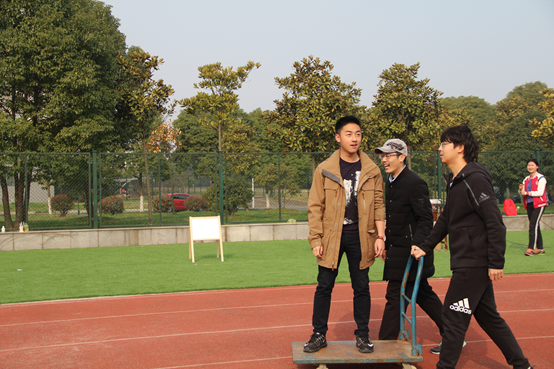 开幕式环节还为大家准备了一个十分特别的小节目——各班班长100米赛跑。班长们拿出了自己的看家本领。图中的小推车可不是送水的工作人员乱入,这就是班长们在以自己的方式进行比赛。这样八仙过海的场景,让大家领略到了一场不一样的短跑比赛。