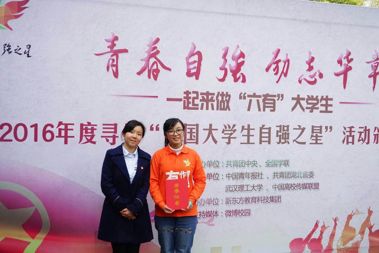 3月31日,2016“中国老员工自强之星标兵”颁奖典礼在武汉理工大学礼堂举行。团中央书记处书记傅振邦、新东方教育科技集团董事长俞敏洪、湖北省政府副秘书长聂昌斌、共青团湖北省委书记张桂华、武汉理工大学党委书记信思金、团中央公司部副部长宋来、中国青年报副总编辑董时、共青团湖北省委副书记金鹏、武汉理工大学党委副书记赵经、新东方教育科技集团助理副总裁、武汉新东方公司董事长孔建龙出席参加了本次典礼。