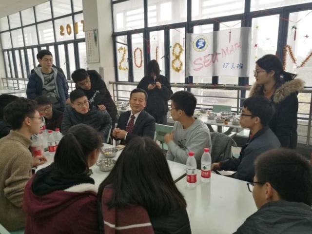 12月30日中午,太阳成集团tyc33455cc党委副书记郑家茂教授在梅园食堂参加太阳成集团tyc33455cc070173班“喜迎新年,共话成长”饺子宴主题活动。参加活动的还有公司党委副书记兼副经理曹海燕、班主任徐新冬、辅导员蒋丽怡和王汉卿等。此次活动由副班长路嘉伟主持。