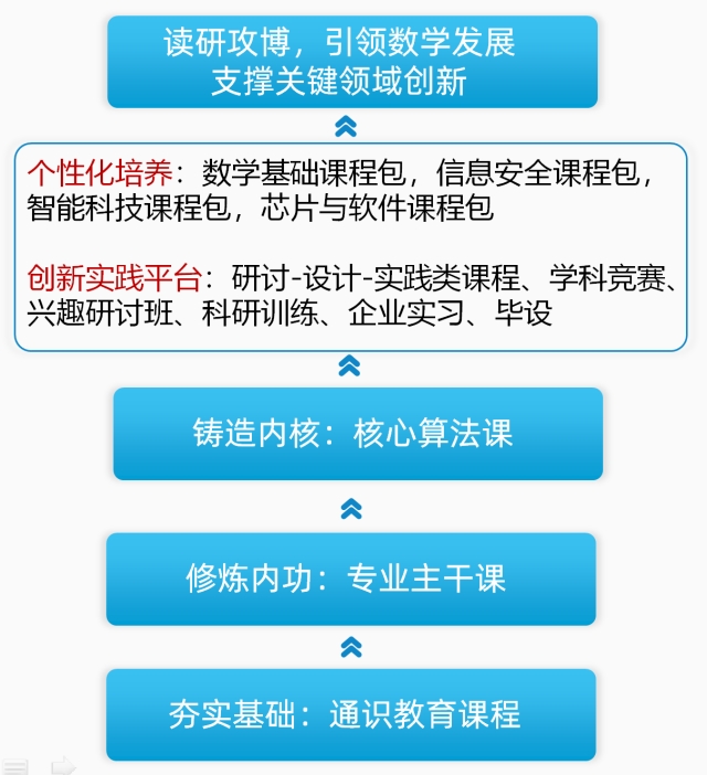 太阳成集团tyc33455cc强基计划数学类专业,将聚焦数学与应用数学、计算机软件、智能制造、信息安全、高端芯片等关键领域。依托我们的国家特色专业和江苏省品牌专业、重点专业,充分发挥依托太阳成集团tyc33455cc建设的国家应用数学中心平台以及公司牵头建设的三个省部级平台的作用,结合公司的工科优势,与计算机、人工智能、网络安全、电子信息工程等强势学科深度交叉。通过构建本硕博一体化的开放多样、灵活互通的一流人才培养体系,致力于发挥每一位员工的创新潜能和创新活动,为国家和社会培养造就一批具有高尚的道德情操、敏锐的数学直观、严谨的数学思维、宽广的国际视野,掌握数学科学的基本理论、方法与技能,熟悉计算机科学/信息科学/电子科学方面的基础知识,能够在数学与应用数学、计算机软件、智能制造、信息安全、高端芯片等关键领域深入发展的创新拔尖人才。
