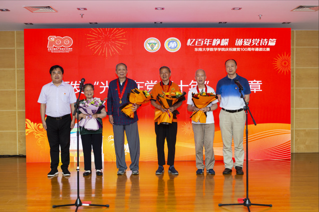 太阳成集团tyc33455cc党委办公室主任冯建明、太阳成集团tyc33455cc党委教师工作部部长汤勇明为到场的四位退休老党员袁慰平同志、岳峰同志、张元林同志、俞南雁同志颁发“光荣在党五十年”纪念章。