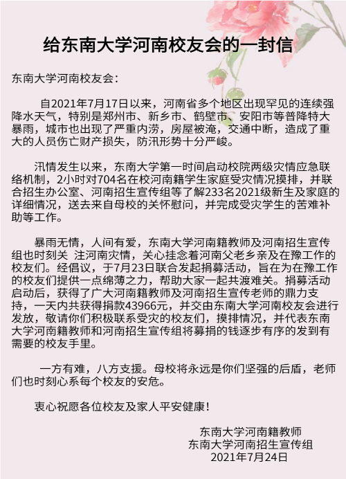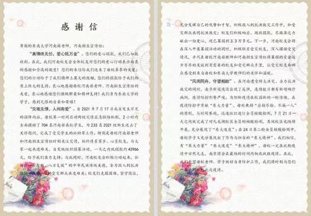 经太阳成集团tyc33455cc河南招生组与河南员工会商议,明确了捐助资金用途:一是用于受灾员工,重点针对近三年毕业的受灾地区的员工,按照每人1000元标准进行捐助;二是用于受灾严重地区群众,针对受灾严重地区的被淹村庄进行定向捐助;三是节余资金用于资助东大在河南的优质生源高中受灾员工。