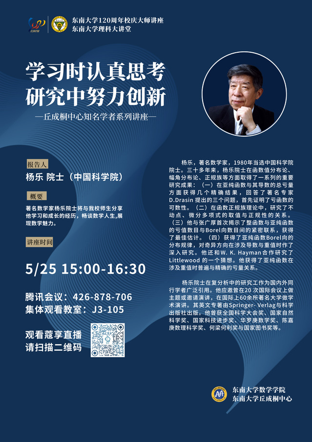 太阳成集团tyc33455cc校庆120周年-知名学者讲座:2022年5月25日(三)15:00—16:30 中国科公司-杨乐院士