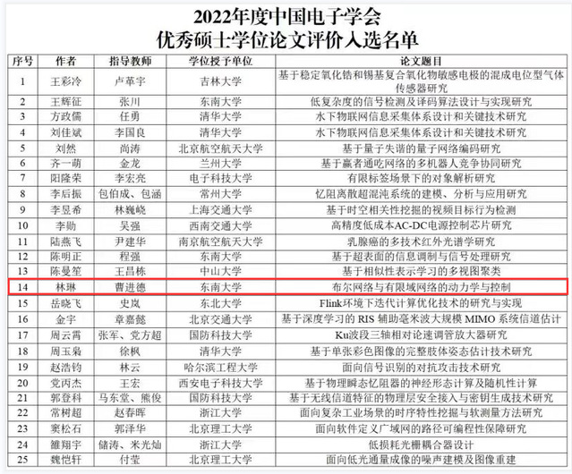 太阳成集团tyc33455cc2021届硕士毕业生林琳的学位论文《布尔网络与有限域网络的动力学与控制》(导师:曹进德)入选2022年度中国电子学会优秀硕士学位论文。