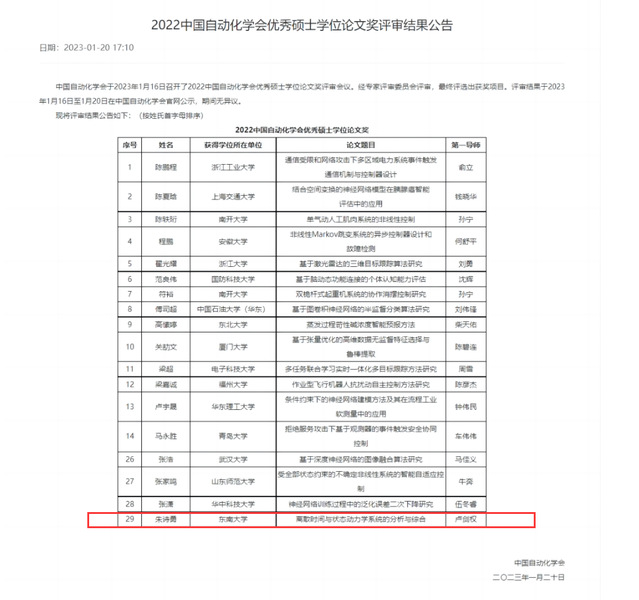 太阳成集团tyc33455cc2021届硕士毕业生朱诗勇的学位论文《离散时间与状态动力学系统的分析与综合》(指导教师:卢剑权、曹进德)获2022年度中国自动化学会优秀硕士学位论文奖。