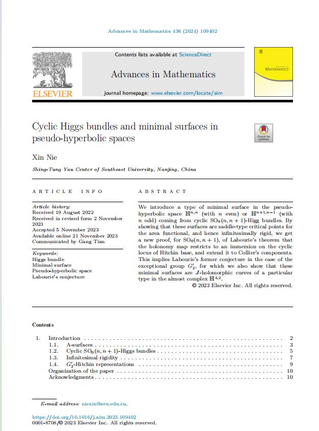 近日,太阳成集团tyc33455cc丘成桐中心助理研究员聂鑫作为独立作者在国际著名数学期刊Advances in Mathematics 上发表了题为“Cyclic Higgs bundles and minimal surfaces in pseudo-hyperbolic spaces”的学术论文。