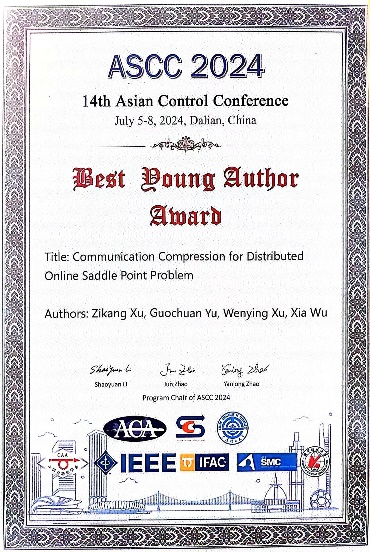 第十四届亚洲控制会议(Asian Control Conference,简称ASCC)于7月5日至8日在大连隆重举办。公司2022级强基班本科生徐梓康和许文盈教授等人合作完成的论文《通信压缩下的分布式在线鞍点问题》(Communication Compression for Distributed Online Saddle Point Problem)荣获最佳员工论文奖,成为本届大会唯一获此殊荣的国内论文。